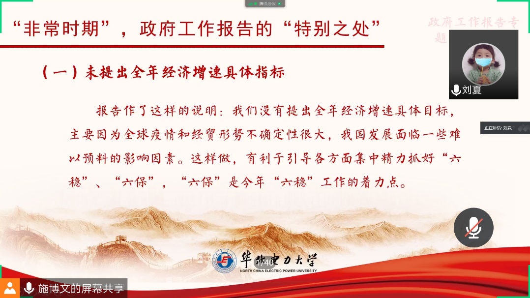 专题学习围绕“经济增长速度、积极财政举措、“六稳、六保”、健全法制体系”等主题进行了系统学习,刘夏同学结合自身理解对政府工作报告进行详细解读。