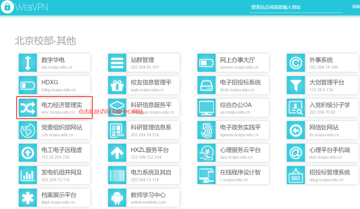 校外的同学报名需要先登录https://webvpn.ncepu.edu.cn/,认证通过后,点击“电力经济管理实验…”按钮进入电力经济管理虚拟仿真实验教学中心网站(emc.ncepu.edu.cn)。