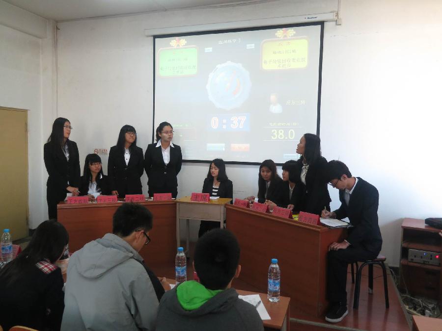 同学们都提前15分钟到场静候比赛的开始,现场可谓是井然有序。辩论在主持人的开场白下拉开序幕,经过主持人对到场评委的介绍和正反方辩手的自我介绍,比赛正式开始。