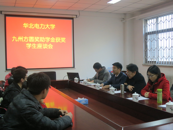2014年12月2日下午,九州方圆奖助学金获奖员工座谈会在教二106室举行。这次座谈会请来了九州方圆的总监颜平进先生,与获此奖学金的员工进行交流和座谈。此外,到场嘉宾还有经济与管理公司党委副书记赵军伟、团总支书记吴薇,电气与电子工程学院12级辅导员李双阳。
