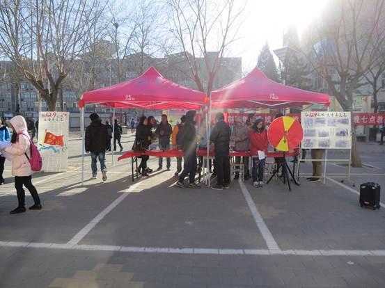 本次活动主要由三部分组成。首先通过转盘游戏进行有奖问答,问题主要是关于“一二·九”运动的知识,参与的同学都有机会获得精美的小礼品和“一二·九”运动纪念照片,同学们积极参与,现场气氛十分活跃;然后同学们在红色条幅上签上了自己的名字,同时也留下了他们对此运动的感想;最后一部分是同学们唱红歌,来表达对祖国的美好祝愿。