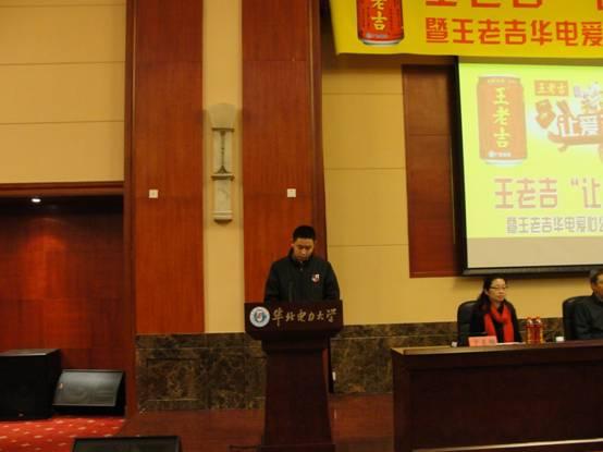 活动开始前,我们为大家播放了王老吉公司的宣传视频。与会员工、领导入场后,活动正式开始,主持人为各位到场来宾介绍本次活动的背景资料,使大家对本次活动有大致的了解。随后,王老吉北京市场部经理陈鑫发言,他希望能将“让爱吉时回家”传承下去,让更多的经济困难的同学感受王老吉公司给予的温暖,并且让王老吉青春正能量项目有更加长远的发展。