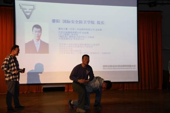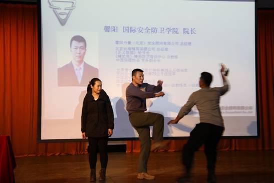 然后,国际安全防卫学院经理、馨阳力量安全顾问有限公司总经理馨阳先生给同学们带来了精彩的现场示范教学。馨阳老师邀请了在场的员工进行互动,同时传授给大家一些遇到危险能帮助机智逃脱的方法与技巧,例如虎口逃脱等,旨在告诉同学们如何正确而成功地如何逃脱匕首、菜刀等凶器的威胁。现场观众反应热烈,积极配合教学,对馨阳老师的技术赞不绝口,掌声此起彼伏。