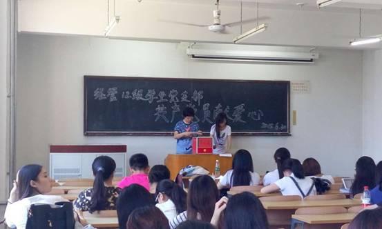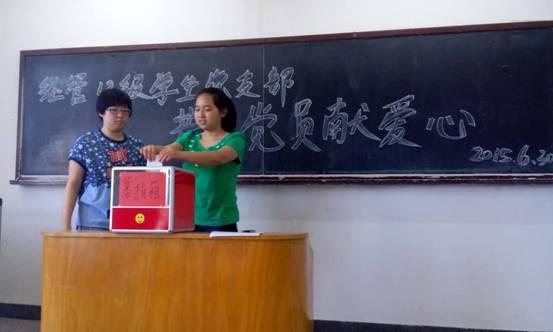 随后,开始捐款,由各班员工代表依次将班级捐赠投入募捐箱,将爱心传递下去。最后,由闫嘉程同志代表,将304永利集团2012级员工党支部全体成员的捐款投入募捐箱。
