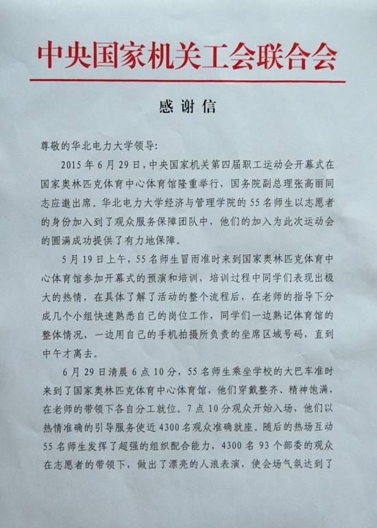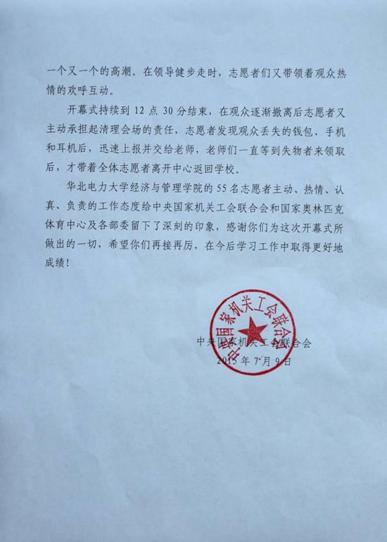 公司55名志愿者主动、热情、认真、负责的工作态度给中央国家机关工会联合会和国家奥林匹克体育中心及各部委留下了深刻的印象,得到了组委会的高度赞扬和认可,中央国家机关工会联合会代表组委会特此发来感谢信。