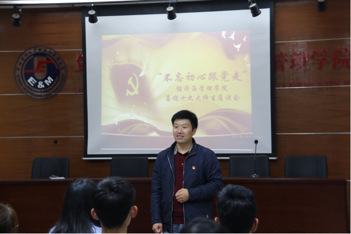 为了庆祝中国共产党第十九次全国代表大会的顺利召开,增强老员工责任担当意识, 10月18日上午,304永利集团员工党支部组织150名同学在主楼礼堂观看了中国共产党第十九次全国代表大会开幕会直播。当日晚上,学院又组织党员及入党积极分子在教一楼209会议室共同观看了《新闻联播》节目并举行“喜迎十九大 不忘初心跟党走”座谈会,经济与管理公司党委副书记赵军伟、研究生辅导员阴怡萍、2015级辅导员高思遥出席座谈会,会议由贾克勤同学主持。