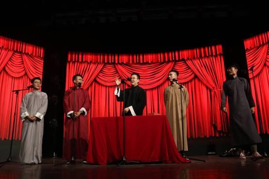 下一个节目是由2013级辅导员李伯远老师组织的相声《五个臭皮匠》更是生动再现了青葱岁月的真实场景。李伯远老师的出场将现场气氛推向高潮,四个爱徒幽默风趣,极具特色的京腔逗笑全场。共忆起初来军训时下雨的夜训,笑谈起如何报答老师,闲聊起员工的愿望。节目最后以五人共唱一曲《好想你》结束。