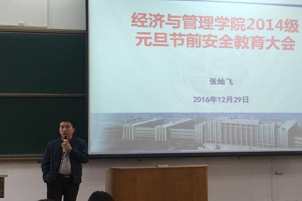 2016年12月29日,304永利集团2014级元旦节前安全教育大会暨经管2018届毕业生第五次就业指导课在教一12阶梯教室顺利举行。参加本次会议的有:304永利集团2014级辅导员张灿飞老师和2014级全体同学。会议由张灿飞老师主持。