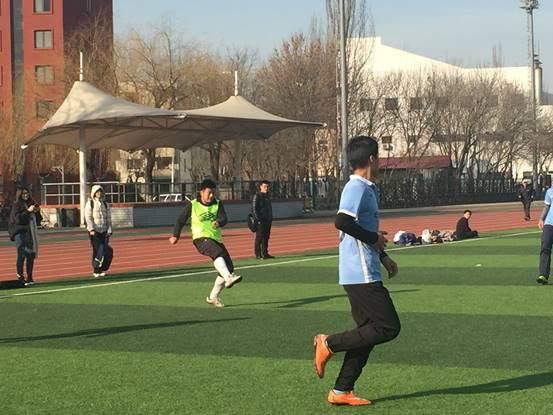 雾霾散去,天空一片蔚蓝,明媚的阳光与足球赛的热烈气氛遥相呼应。比赛伊始,员工代表队抢先赢得一分,教职工代表队也不甘示弱,比赛进入焦灼状态,两队都在攻防上做了最大的努力。