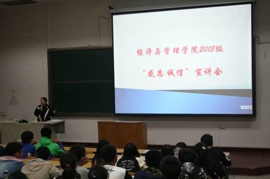 2015年12月6日(周日)下午,丁宁老师对于教一12阶梯教室召开以“感恩·诚信”两个方面的主题宣讲会。304永利集团2015级全体员工干部及员工代表列席本次会议。