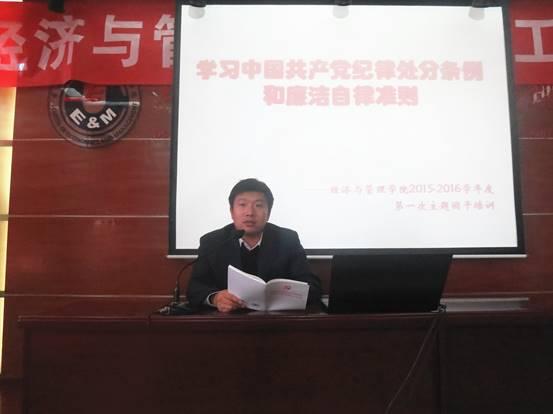 首先,由赵书记讲授此次团干培训的核心内容。赵书记首先讲述了自己对《条例》和《准则》的三个体会:第一,“全面从严治党”已然成为一种趋势;第二,对于一个党员来说“中国共产党纪律处分条例”相当于刑法,可见其处罚的规定之严;第三,“抓早抓小,动辄则咎”对整个社会有着极强的现实意义。同时,赵书记还特别强调,开展此次培训活动并不是单纯为了让同学熟知《条例》和《准则》的内容,更重要的是学习其中的精神实质和内涵,并将其内化于心,外化于行,在日常生活中处处以此为准则并努力饯行。赵书记还为同学们讲解了《准则》的具体内容。他指出,为深入贯彻党的十八大及十八届三中四中全会,坚持“一规治党”、“以德治党”的理念,中国共产党制定了第一部坚持正面倡导、面向全体党员的规范全党廉洁自律工作的重要基础性法规,即《中国共产党廉洁自律准则》。它是对党章规定的具体化,体现了全面从严治党实践成果,为党员和党员领导干部树立了一个看得见、够得着的高标准,展现了共产党人的高尚道德追求。赵书记还希望同学们能够透过新闻看社会,这样有助于更好的了解国家形势和政策。